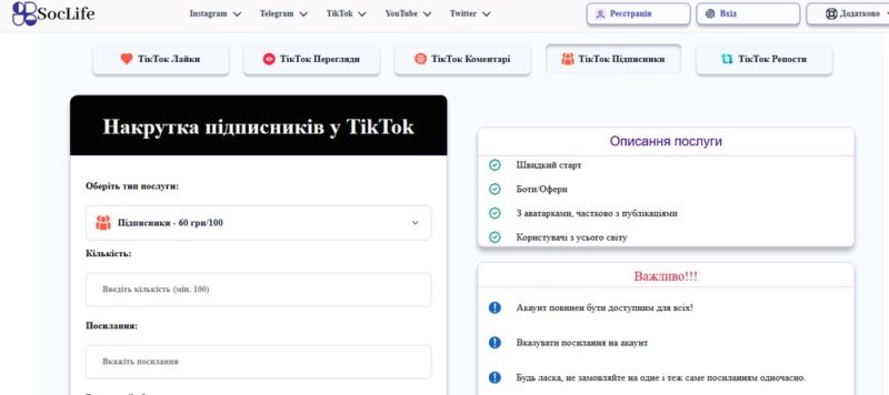 • Socialife.com.ua — український сервіс, що пропонує накрутку підписників у TikTok з акцентом на безпеку. Не вимагає паролів, виконує замовлення вчасно, підтримка 24/7, реальні акаунти.