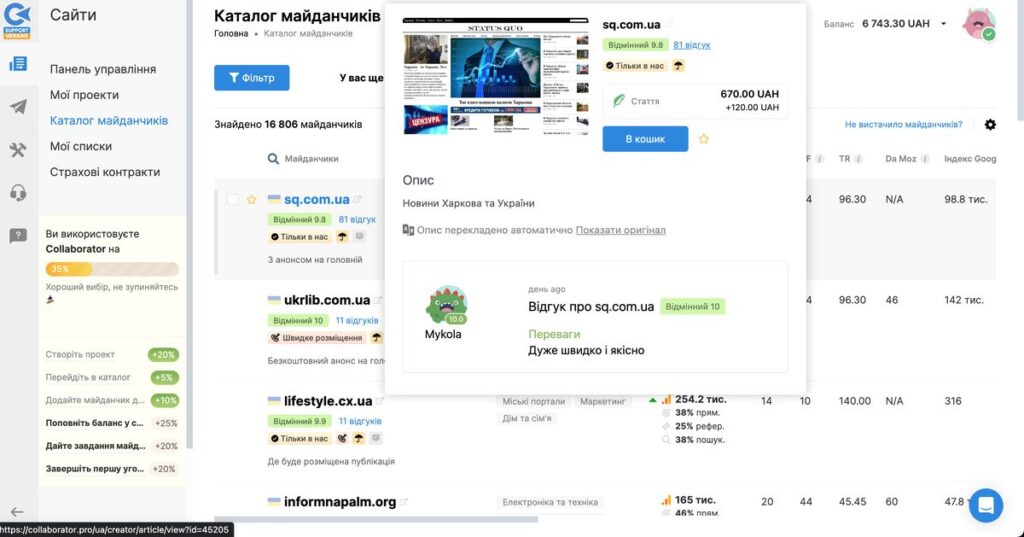 Collaborator — это именно украинская биржа ссылок, которая сейчас имеет в арсенале более 16000 различных площадок для размещения платных публикаций. Collaborator позволяет заказчикам выбирать сайты по разным параметрам, таким как показатели рейтинга и авторитета сайта, различным тематикам и языкам, стране происхождения, цене, типу публикации и т.д.