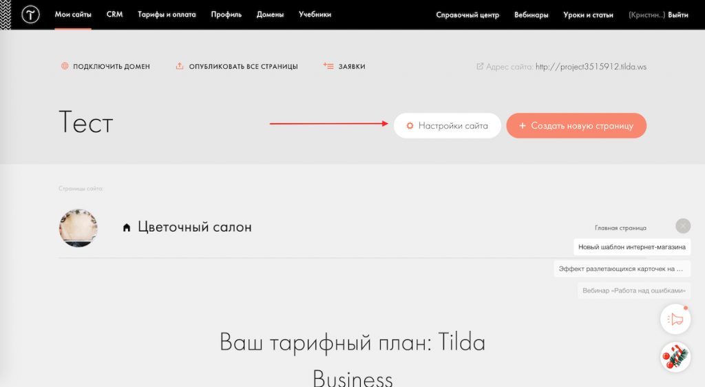 Переходим в интерфейс Тильды и заходим в настройки сайта:
