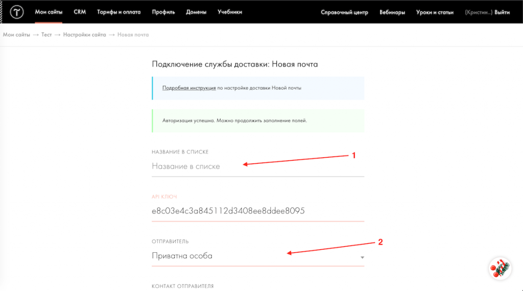 2. Отправитель. В моем случае, при регистрации в Новой Почте я выбрал Приватну Особу и именно это отобразилось в настройках Тильды.