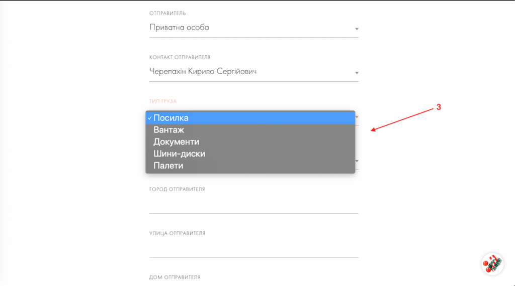 1. Тип Груза. Выберите, что вы будете отправлять из списка