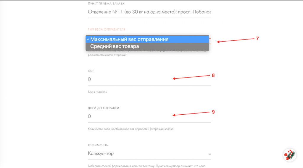 1. Тип веса отправления. Выберите значения, которое будет учтено при расчете стоимости доставки.