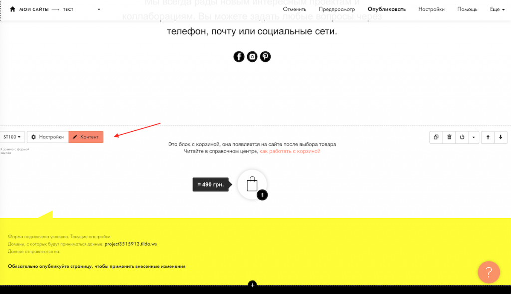 Идем на страницу сайта в Тильде, где вы разметили блок с корзиной. Находим блок корзины и жмем КОНТЕНТ: