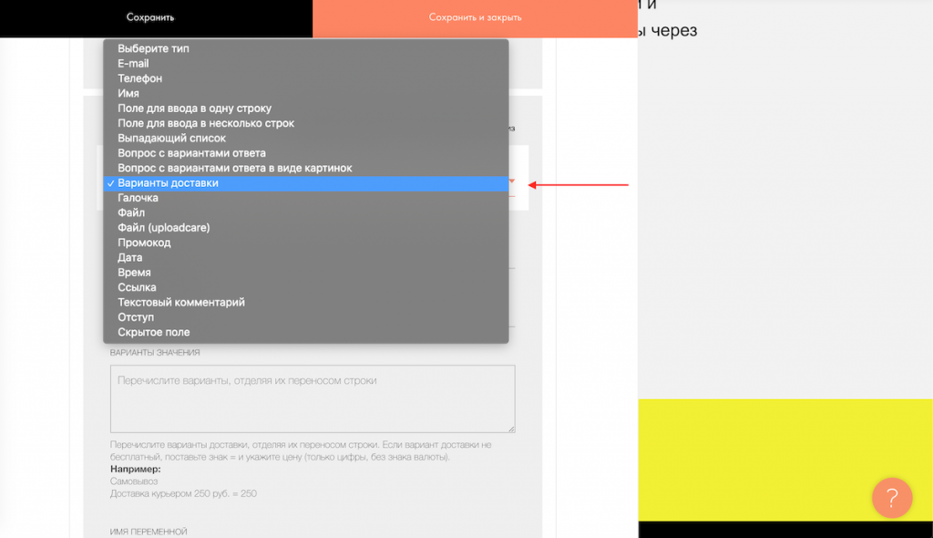 Добавляем новое поле и выбираем ТИП — «Варианты доставки»: