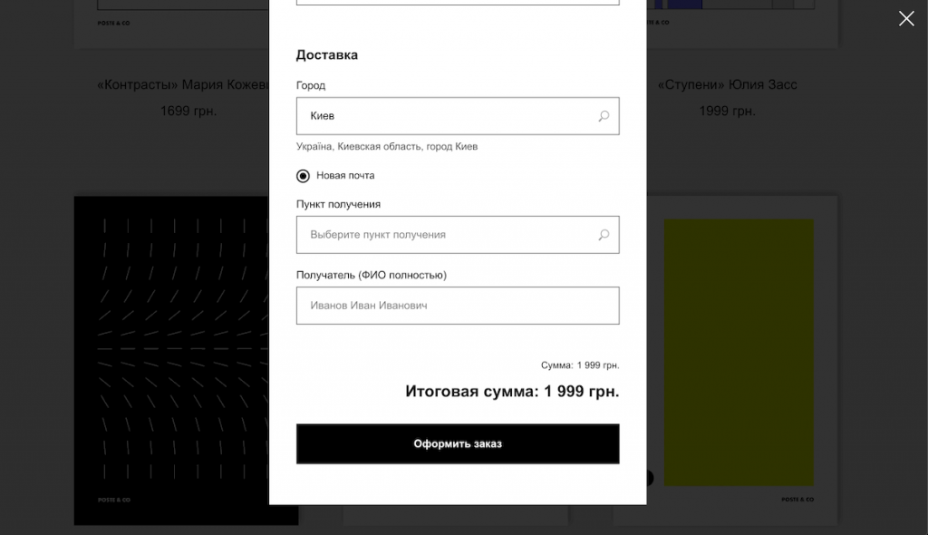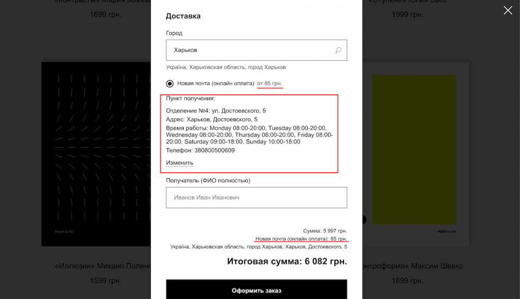 В окне корзины при вводе данных получателя (Города и отделения) формируется цена и она добавляется к общей стоимости заказа. Дополнительно появляется информация об отделении и графике его работы.