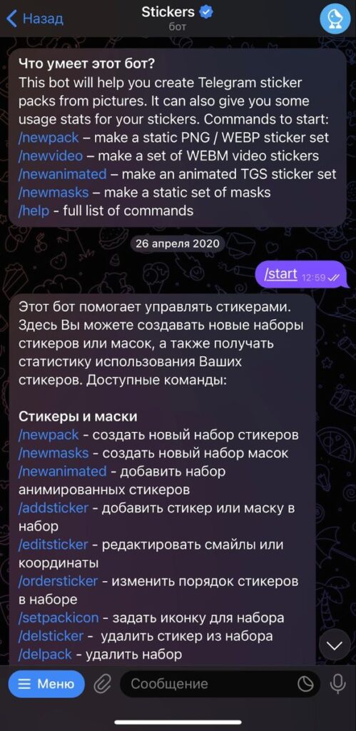 - Команда /start запускает процесс. Просто введите ее в открытом чате с помощью стикер-бота.