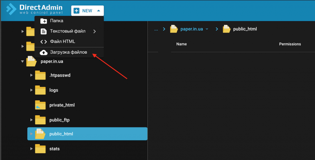 Когда вы почистили папку «public_html», оставайтесь в ней. Вверху есть кнопка «new». Нажимайте на нее и в выпадающем окне жмите «Загрузка файлов»: