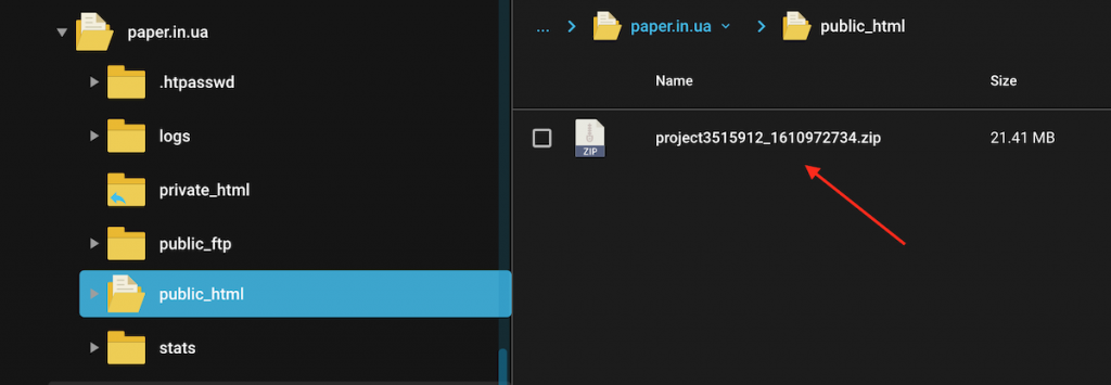 Кликните по этой папке и вам откроются все ваши домены. Выберите нужный (в моем случае, это paper.in.ua) и кликните по нему. Затем кликайте в папку «public_html»: