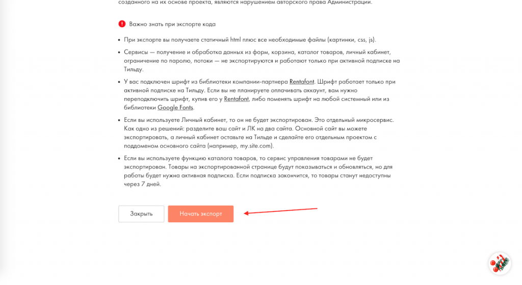 Теперь можете снова прочитать все условия скачивания, а затем опускайтесь вниз страницы и нажмите на кнопку «Начать экспорт»:
