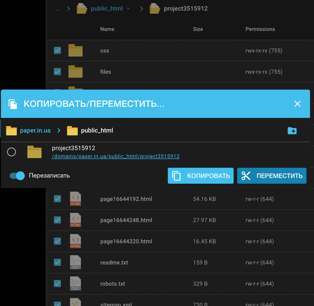 Выделите все файлы и кликните правой кнопкой по ним (вызовите свойства). Выберите пункт «Копировать/переместить». Дальше выберете путь — это путь к папке «public_html»: