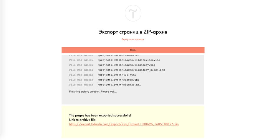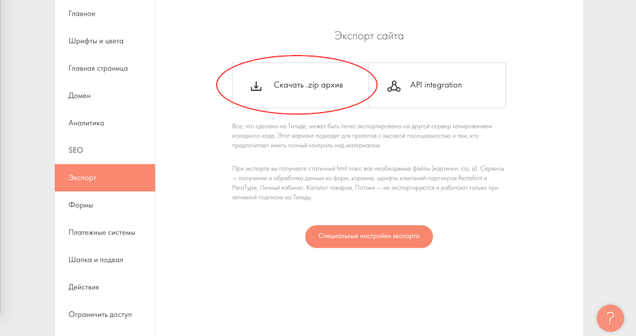 Теперь займемся экспортом. Заходим в настройки сайта в Тильде, переходим во вкладку «Экспорт» и нажимаем кнопку «Скачать .zip архив»