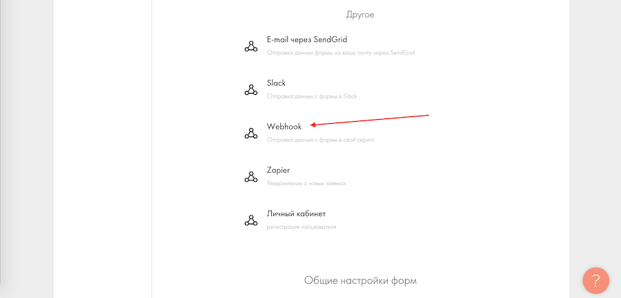 Теперь переходим в интерфейс Тильды и идем в настройки сайта. Во вкладке «Формы» ищем сервис «Webhook»: