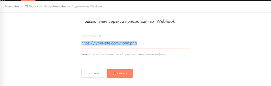Получилось? Отлично, идем дальше. Нажимаем кнопку «Добавить» в Тильде, затем подключаем сервис Webhook ко всем формам сайта и переопубликовываем все страницы сайта в Тильде.