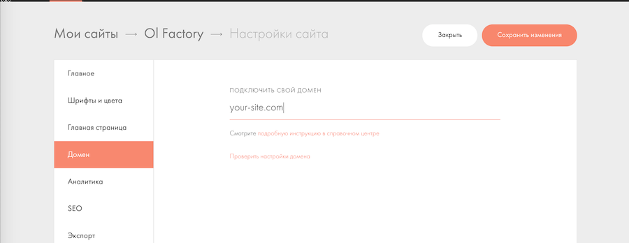 Дальше снова возвращаемся в настройки сайта на Тильде. Заходим во вкладку «Домен» и прописываем сюда ваш домен.