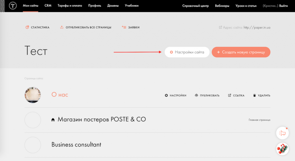 Чтобы начать работу со шрифтами, для начала нужно перейти в настройки сайта: