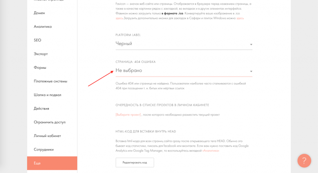 Кстати, подробности о том, как правильно создать страницу 404 я описал в этой статье. Создали? Тогда идем дальше. Заходим в настройки сайта — вкладка «Еще». Вам нужен раздел «СТРАНИЦА: 404 ОШИБКА». Выберите вашу страницу 404 среди всех: