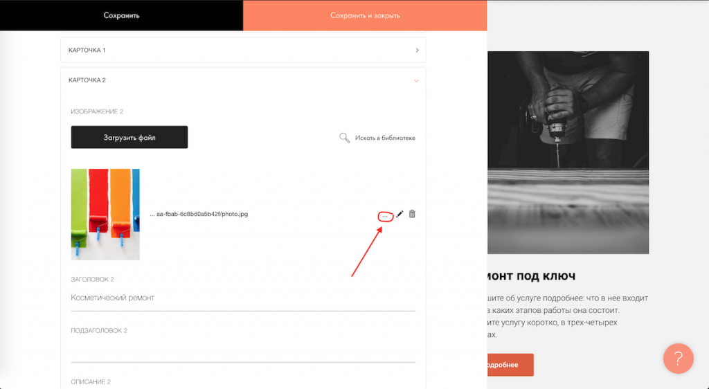 Заходим в КОНТЕНТ стандартного блока. Находим интересующую нас картинку. Справа напротив изображения вы увидите многоточие.