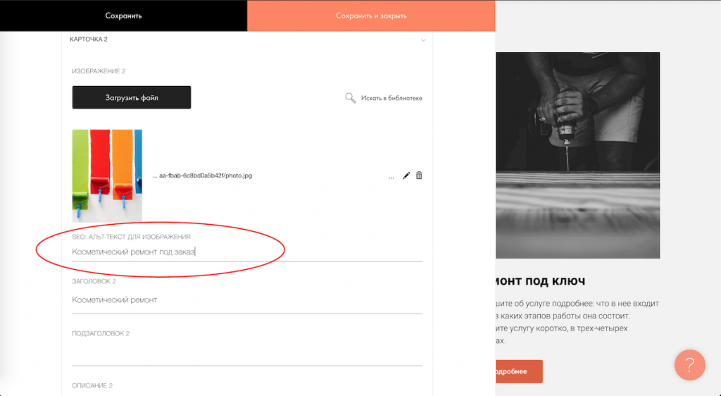 После клика на многоточие под фото появится дополнительное поле «SEO: АЛЬТ-ТЕКСТ ДЛЯ ИЗОБРАЖЕНИЯ», куда вы можете вставить подпись картинки: