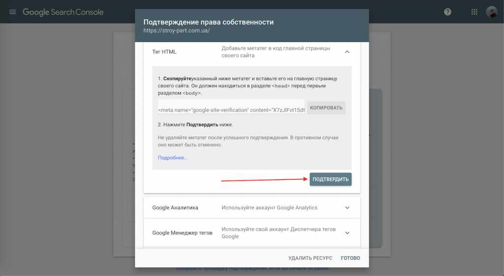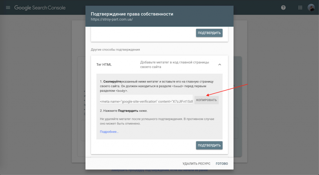 Дальше открывается окно «Подтверждение права собственности» на ваш сайт. Найдите там раздел «Тег HTML» и нажмите кнопку «копировать»: