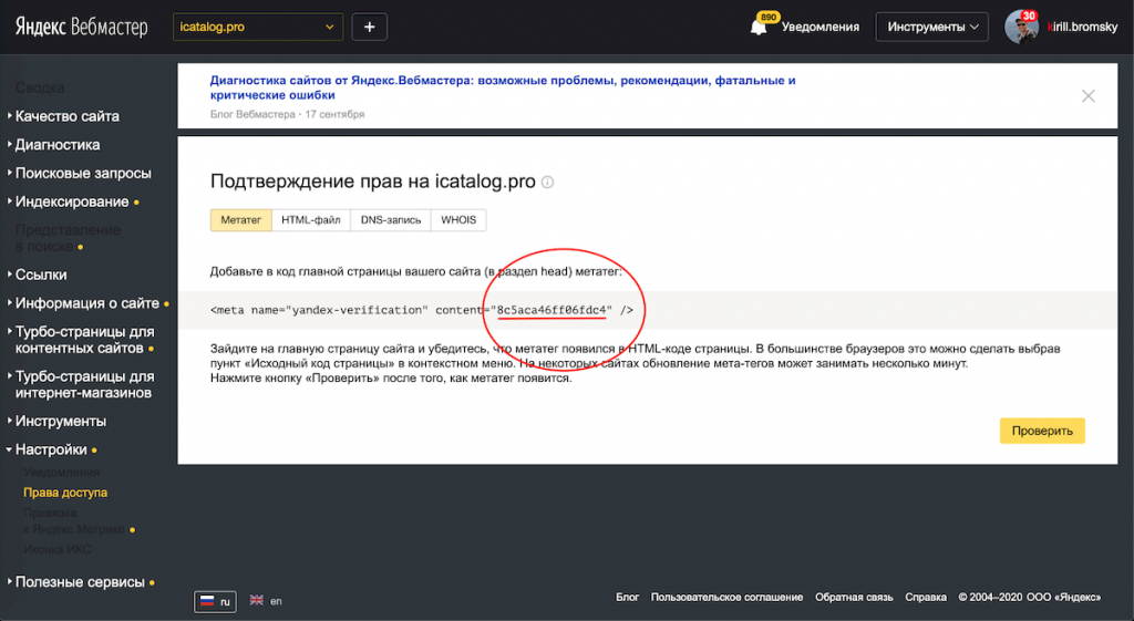 Мы пойдем по тому же пути, как и в случае с Google Search Console — подтвердим права через мета-тег.
