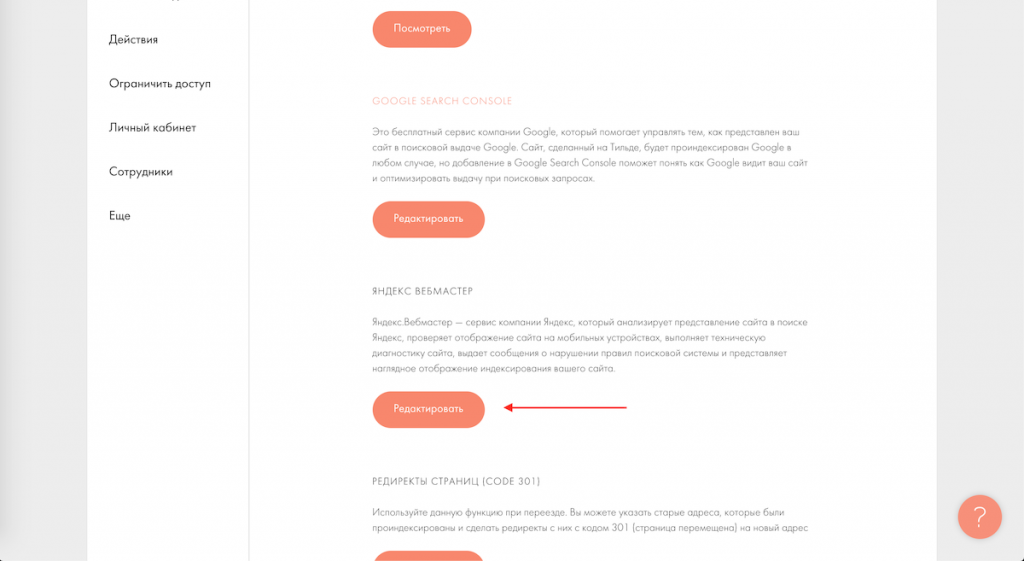 Зайдите в настройки сайта на Тильде. Вам нужна вкладка «Seo». Там вам нужен раздел «Яндекс Вебмастер». Нажимайте кнопку «Редактировать»:
