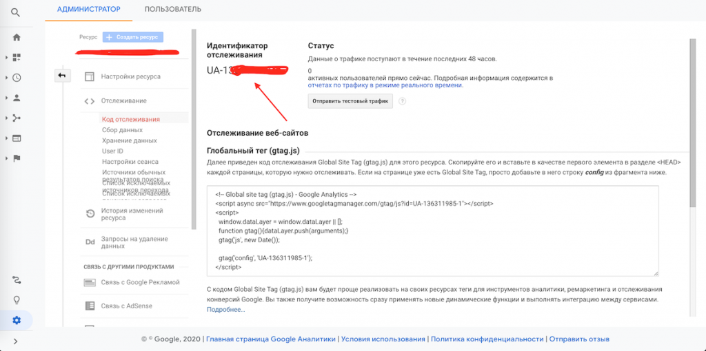 В открывшейся странице ищем «Идентификатор отслеживания» и копируем его: