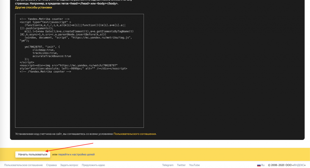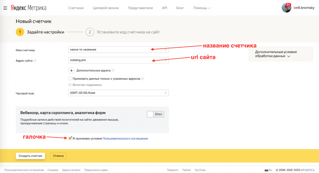 Жмем и переходим дальше. Заполняем поля имени счетчика, адрес сайта, читаем и соглашаемся с условиями пользовательского соглашения и нажимаем кнопку «Создать счетчик»