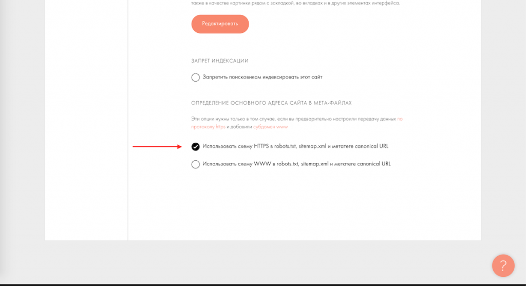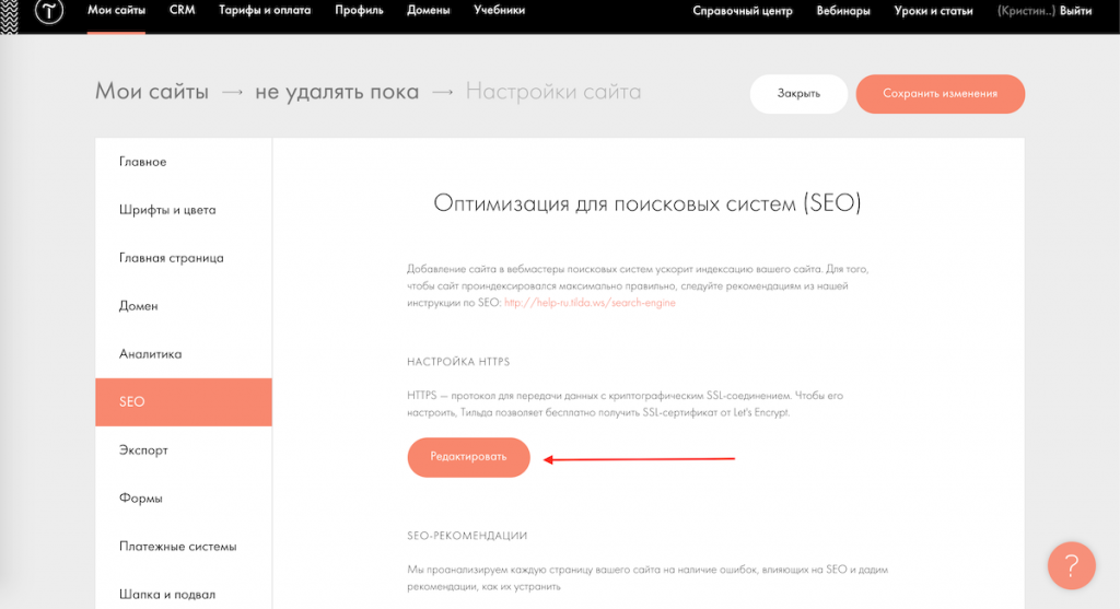 Я рассказывал в другой статье о том, как правильно подключить домен к сайту Тильду. После подключения у вас появится возможность бесплатно включить SSL-сертификат. Заходим в настройки сайта на вкладку SEO:
