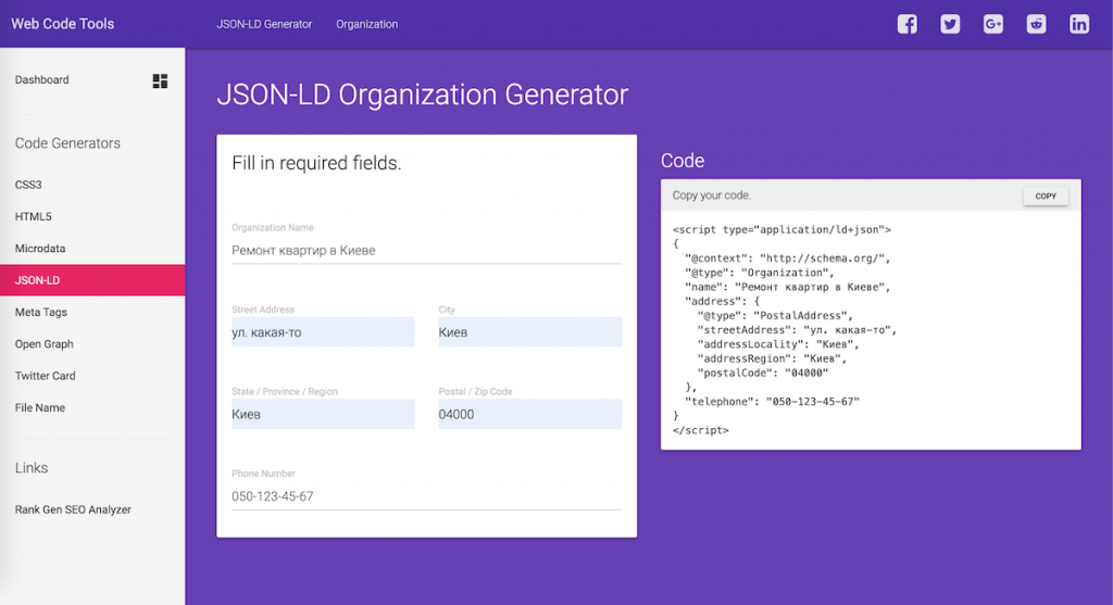 Для генерирования микроразметки можно воспользоваться простым и понятным инструментом на сайте https://webcode.tools/json-ld-generator: