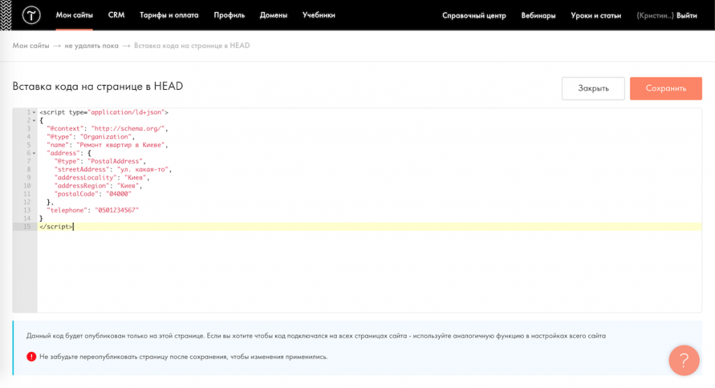 Опускаемся вниз и ищем раздел «HTML-КОД ДЛЯ ВСТАВКИ ВНУТРЬ HEAD». Нижимаем кнопку «Редактировать» и вставляем скопированный код: