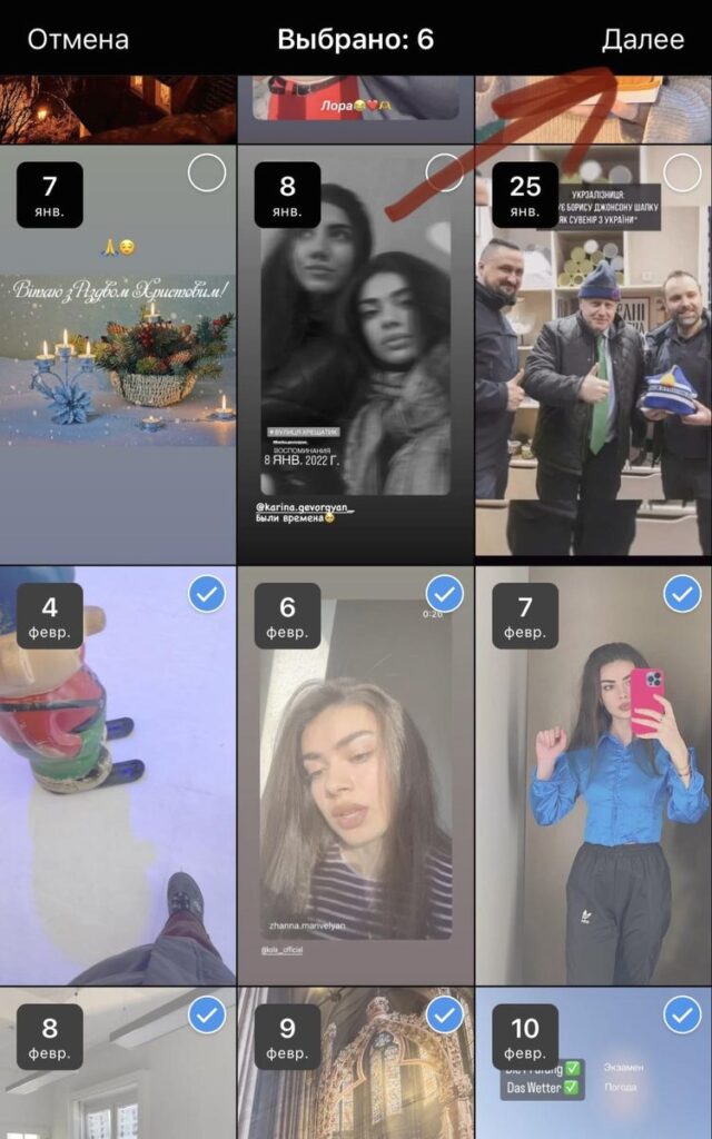 - Далі натискаємо на сторіз, які хочемо додати та вгорі обираємо «далі».
