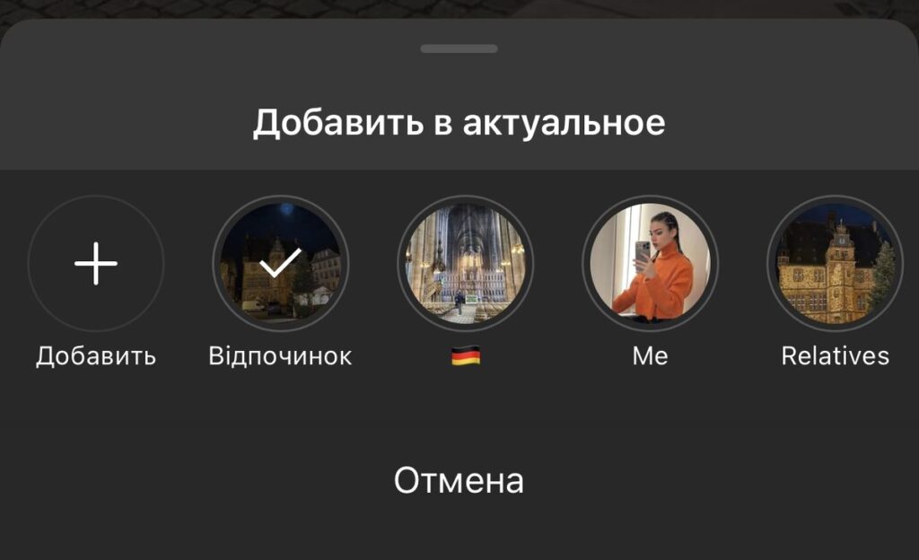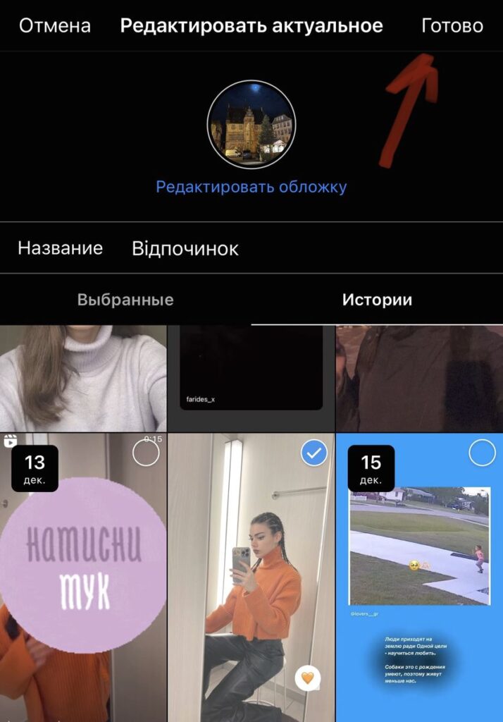 - Переходите на «історії» та натискаєте на галочку в тих історіях, які хочете додати. Натискаєте “Готово”.
