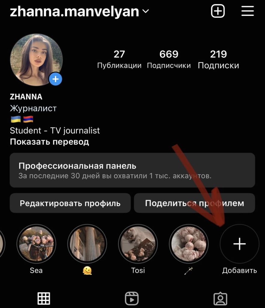 - Переходимо у профіль та знаходимо після останнього хайлайтс іконку «додати».