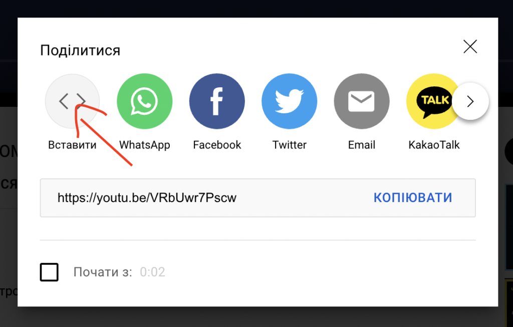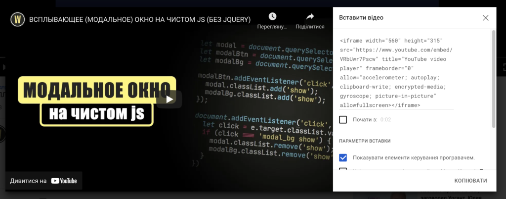 Натискайте кнопку “Вбудувати”, як показано на малюнку. У вас має з’явитися інше модальне вікно (з вашим відео та кодом):