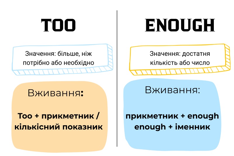 Правила вживання too та enough українською мовою з прикладами