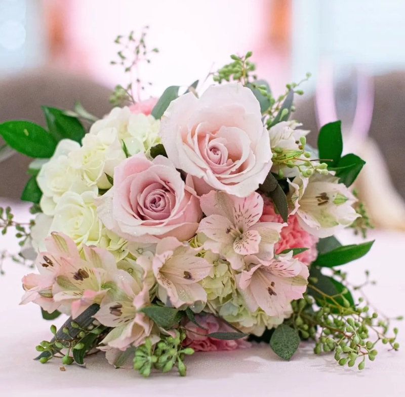 Кулькоподібні суцвіття гортензії заповнюють простір та створюють м’яку фактуру у композиції. Завдяки широкій палітрі кольорів легко вписуються в образ нареченої, додаючи повітряності й легкості. Часто використовуються у поєднанні з трояндами чи півоніями, створюючи візуальну повноту.