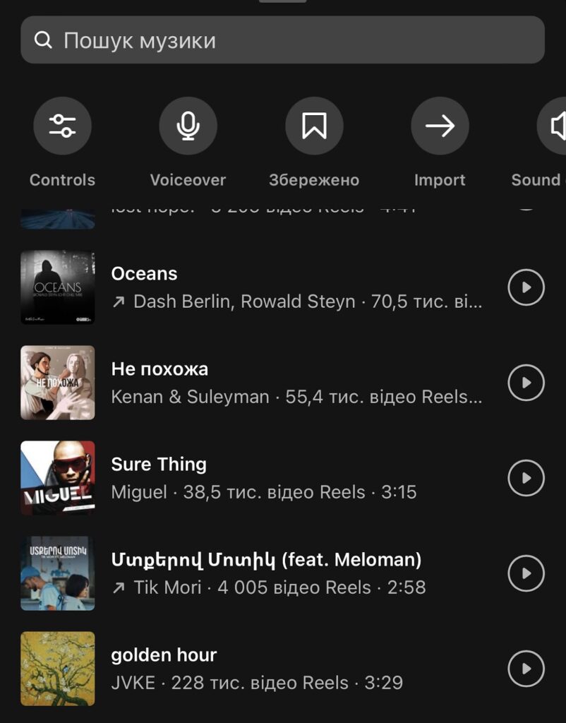 - Підбір музики із бібліотеки інстаграм;