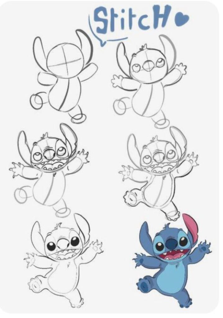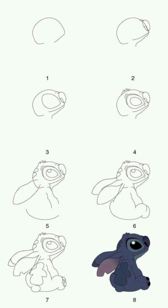 Для початку найкраще обрати варіант, який не потребує складних ліній і тіней. Стіч малюнок легкий – це схематичне зображення з великими вухами, очима та мініатюрним тілом. Такі малюнки часто зустрічаються в дитячих блокнотах, розмальовках або на наклейках.