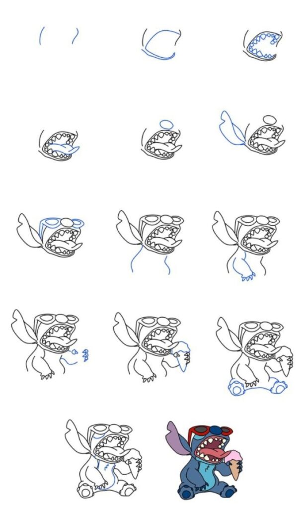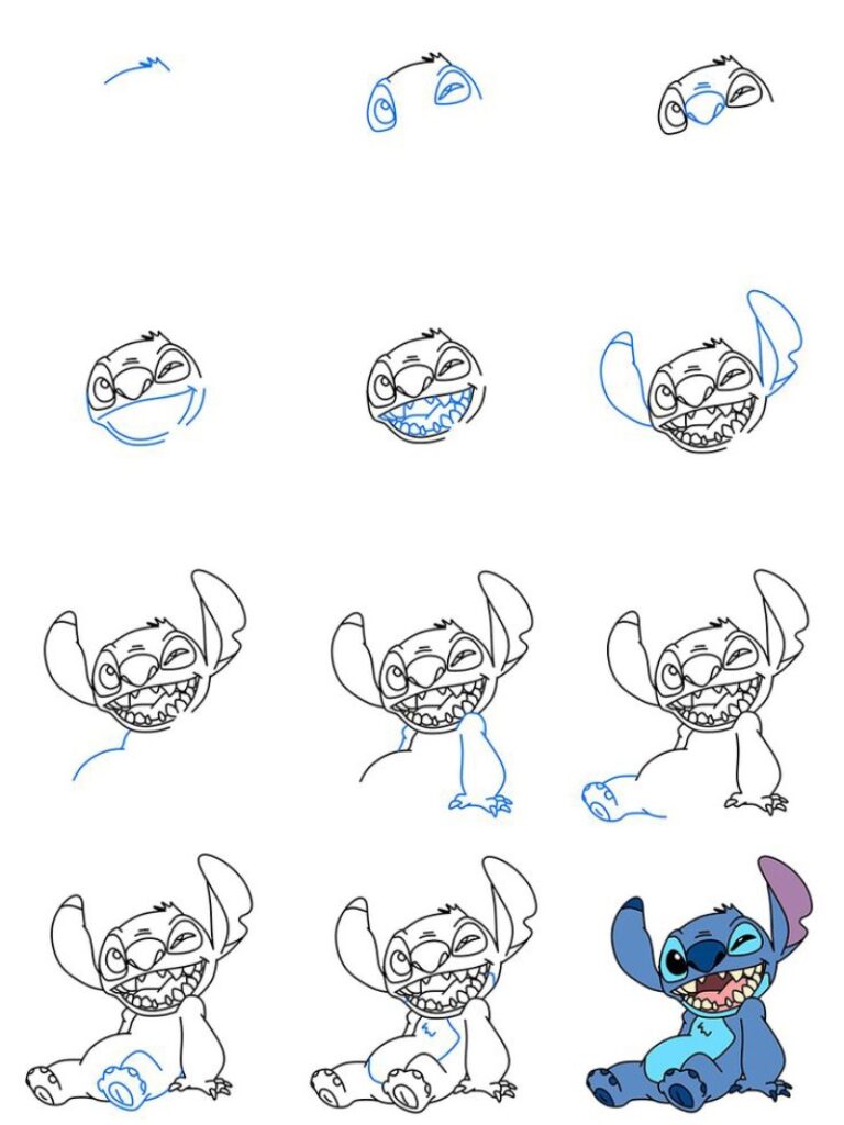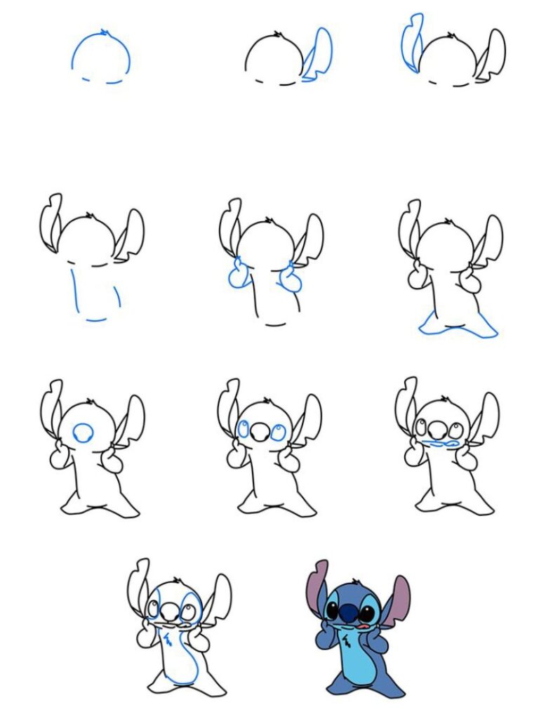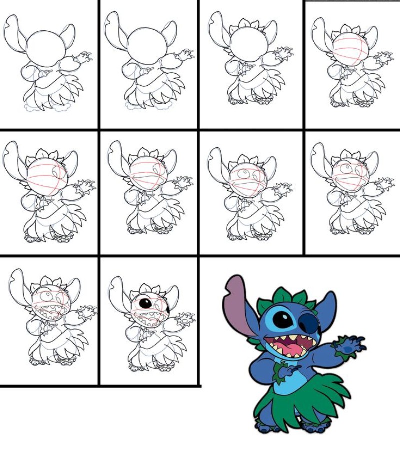 Щоб краще зрозуміти техніку, перегляньте галерею малюнків. Якщо хочеться бачити покрокову інструкцію, знайдіть відео або як намалювати Стіча фото з короткими поясненнями.