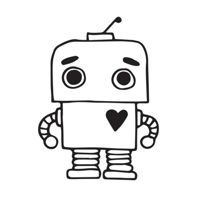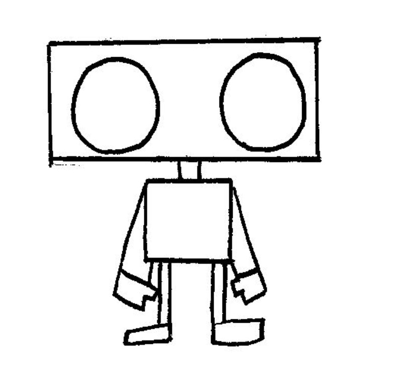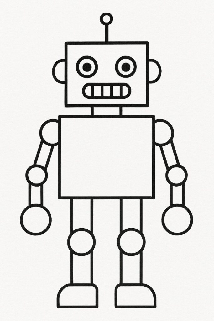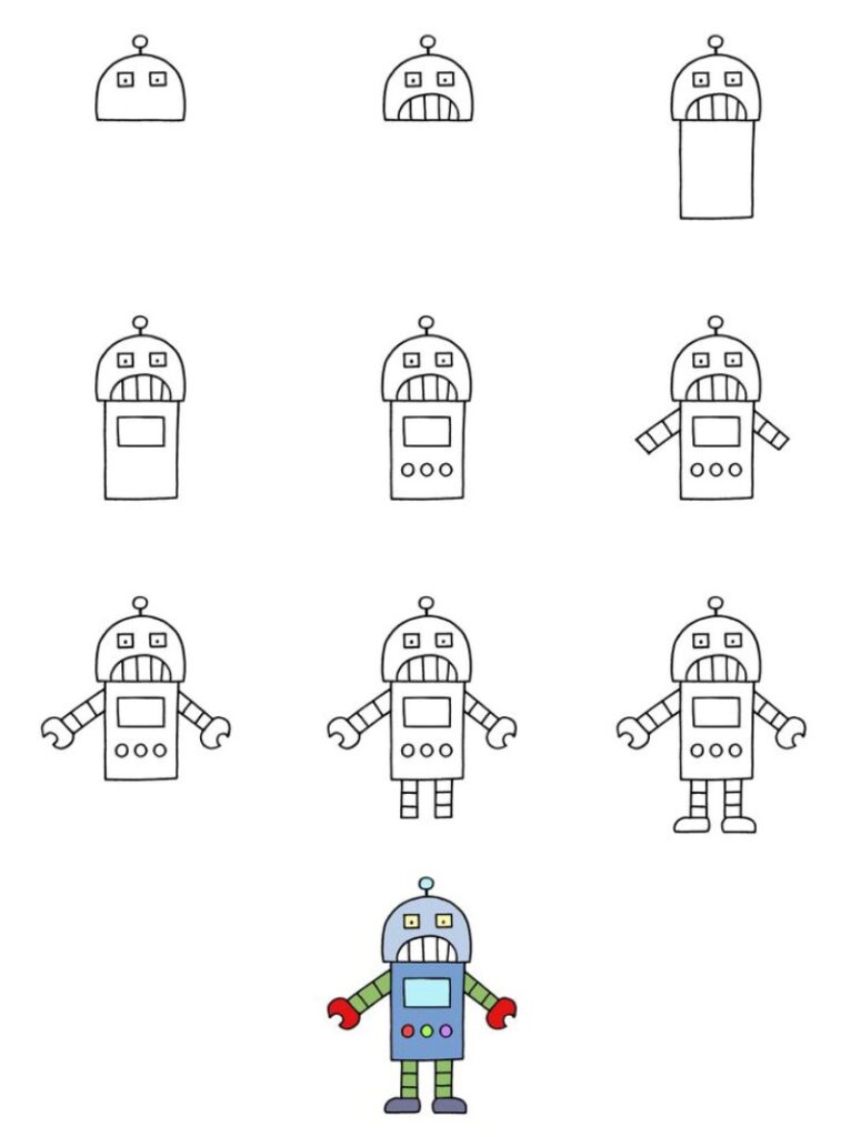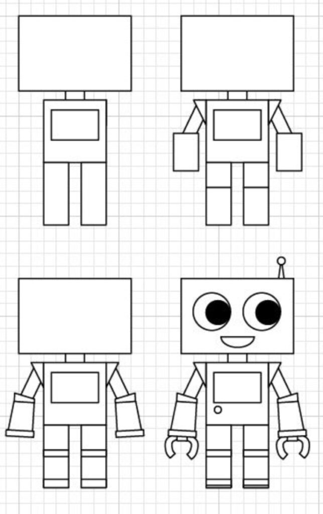 Для голови зазвичай використовують квадрат або коло. Тулуб — прямокутник, руки — лінії з колами або циліндрами, ноги — товсті смуги. Можна додати антени, дисплеї або колеса — все залежить від фантазії.