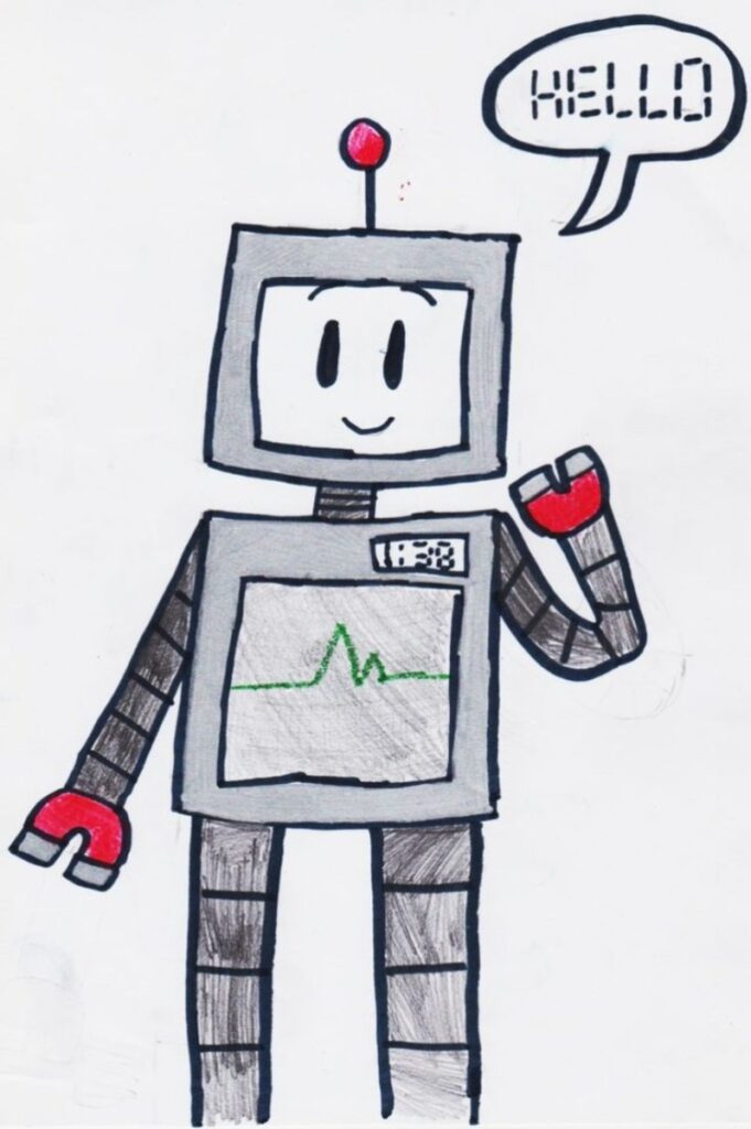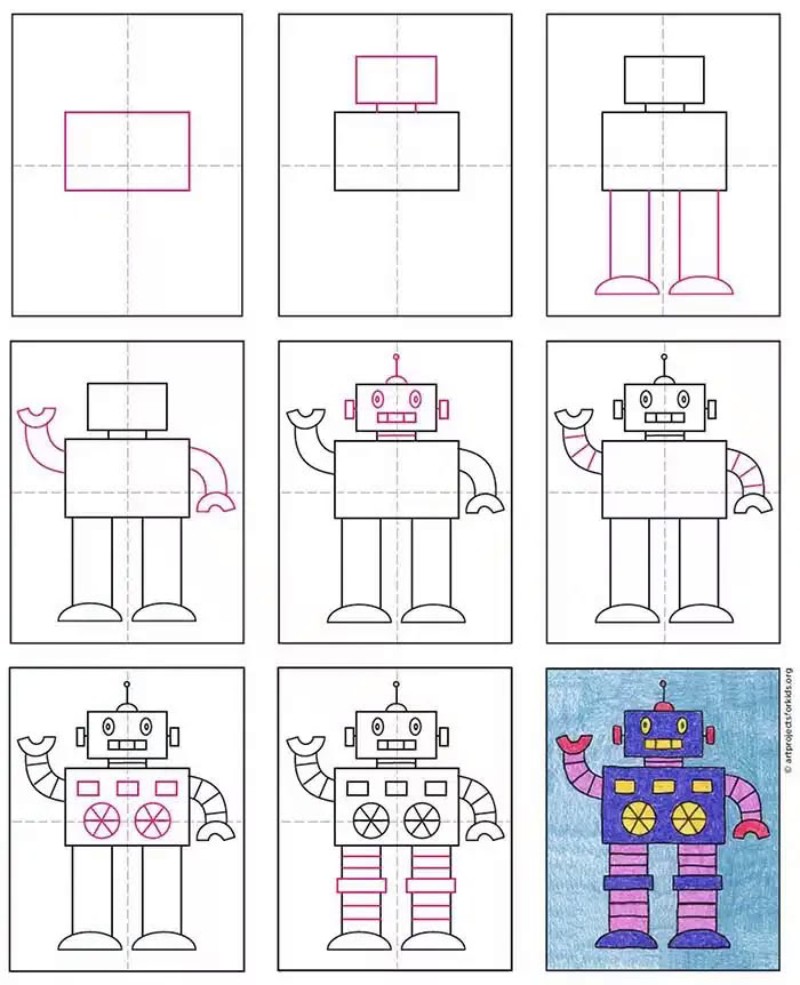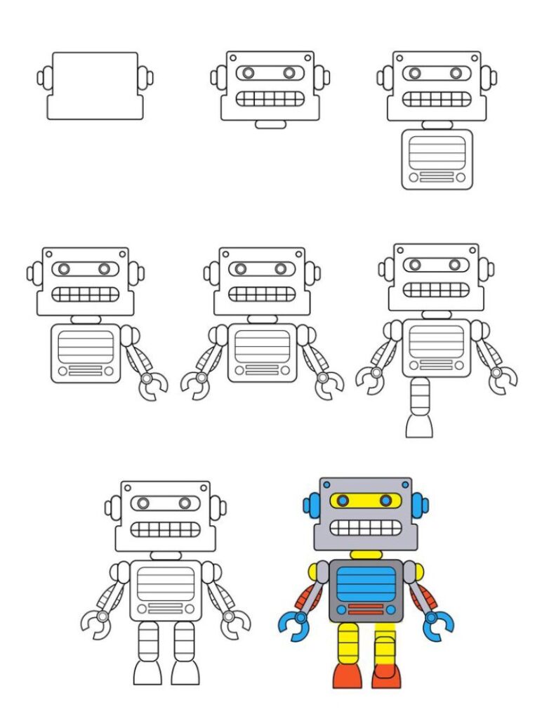 Для голови зазвичай використовують квадрат або коло. Тулуб — прямокутник, руки — лінії з колами або циліндрами, ноги — товсті смуги. Можна додати антени, дисплеї або колеса — все залежить від фантазії.