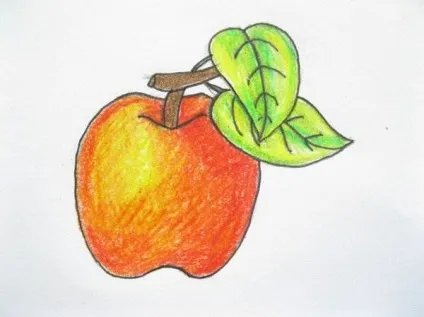 - Яблуко на гілці – намалюйте яблуко, що росте на дереві, з гілкою та листочками. Дитина може додати кілька крапель роси або сонячні відблиски, щоб навчитися передавати об’єм і фактуру.