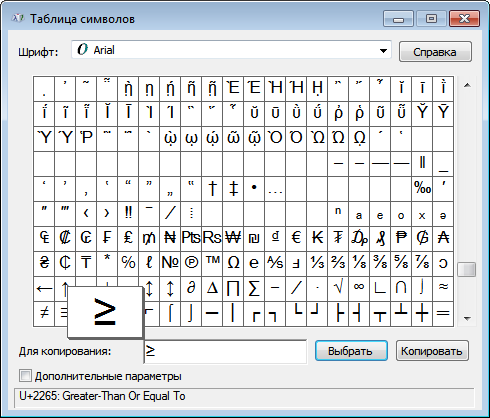 Win + R, введітьcharmapі натисніть Enter). - Знайдіть символ ≥, виберіть його і натисніть кнопку “Вибрати”, а потім “Копіювати”. Тепер ви можете вставити цей символ у свій текстовий документ.