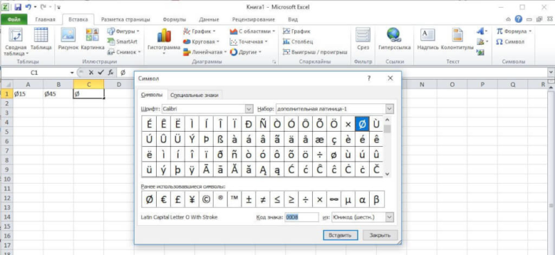 - Прокрутіть список символів або введіть “00D8” у полі “Код знака” для швидкого пошуку символа діаметра Ø.