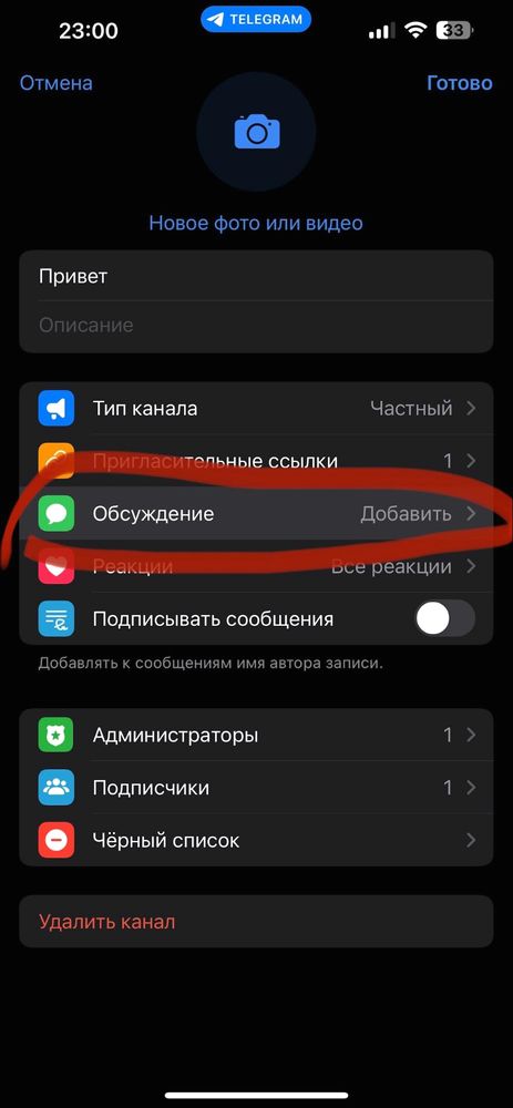 1. У налаштуваннях вже створеного каналу натискаєте на «обговорення».