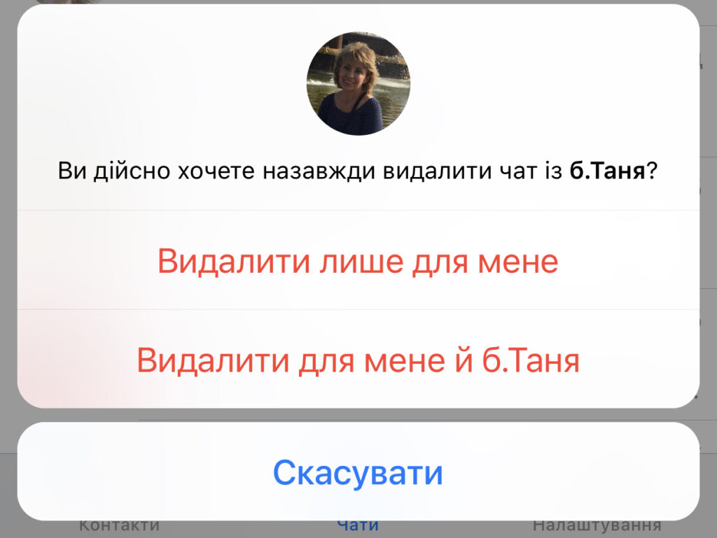 Історія з чатами – така ж сама. Якщо ви видалили листування з людиною – дані зі сховища стираються і при синхронізації на інших пристроях, видаленого матеріалу не буде.