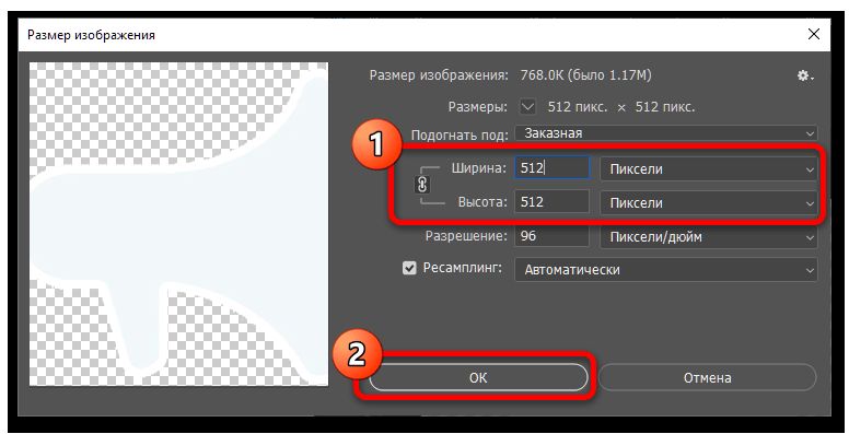 - Тепер виберіть розмір графіки. Для цього змініть значення висоти й ширини на 512. Переконайтеся, що в одиницях вимірювання – пікселі. Підтвердьте вибір кнопкою «ОК». Тепер у вас є файл у правильному форматі.