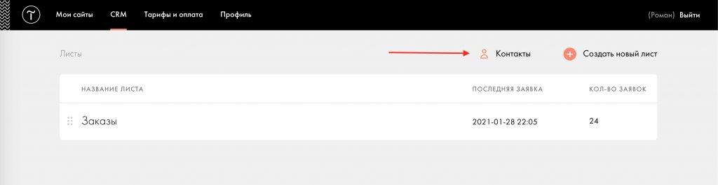 При переходе на стартовую страницу CRM Тильды crm.tilda.cc вы увидите кнопку «Контакты», где можно увидеть всю информацию о клиентах, которые уже делали покупки или совершали конверсионные действия: