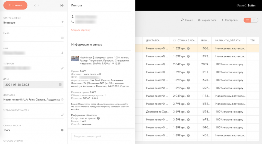Кликнув на любую строку, вы получаете более детальную информацию о покупателе и его заказе: